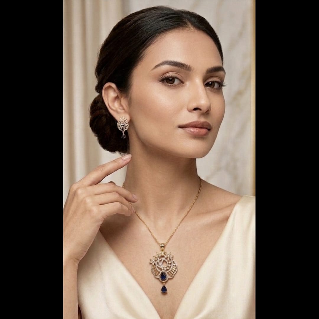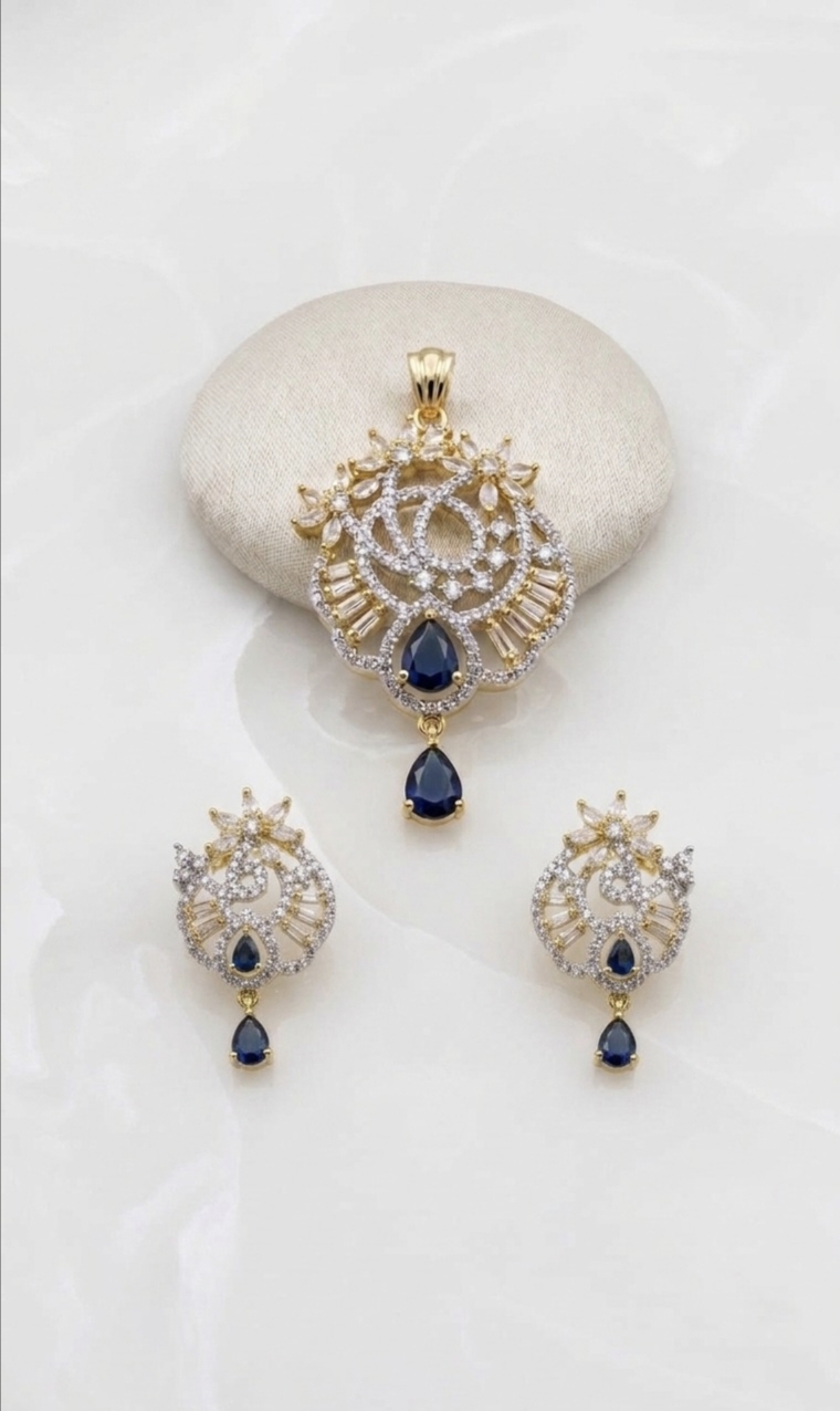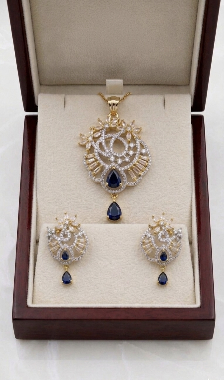 Feel the rhythm of elegance with our Ocean Heartbeat Pendant Set, a design inspired by the deep beauty and calm strength of the ocean. This stunning set features a luxurious gold-tone finish, delicately adorned with sparkling American diamonds and rich blue teardrop stones that capture the essence of ocean waves.
