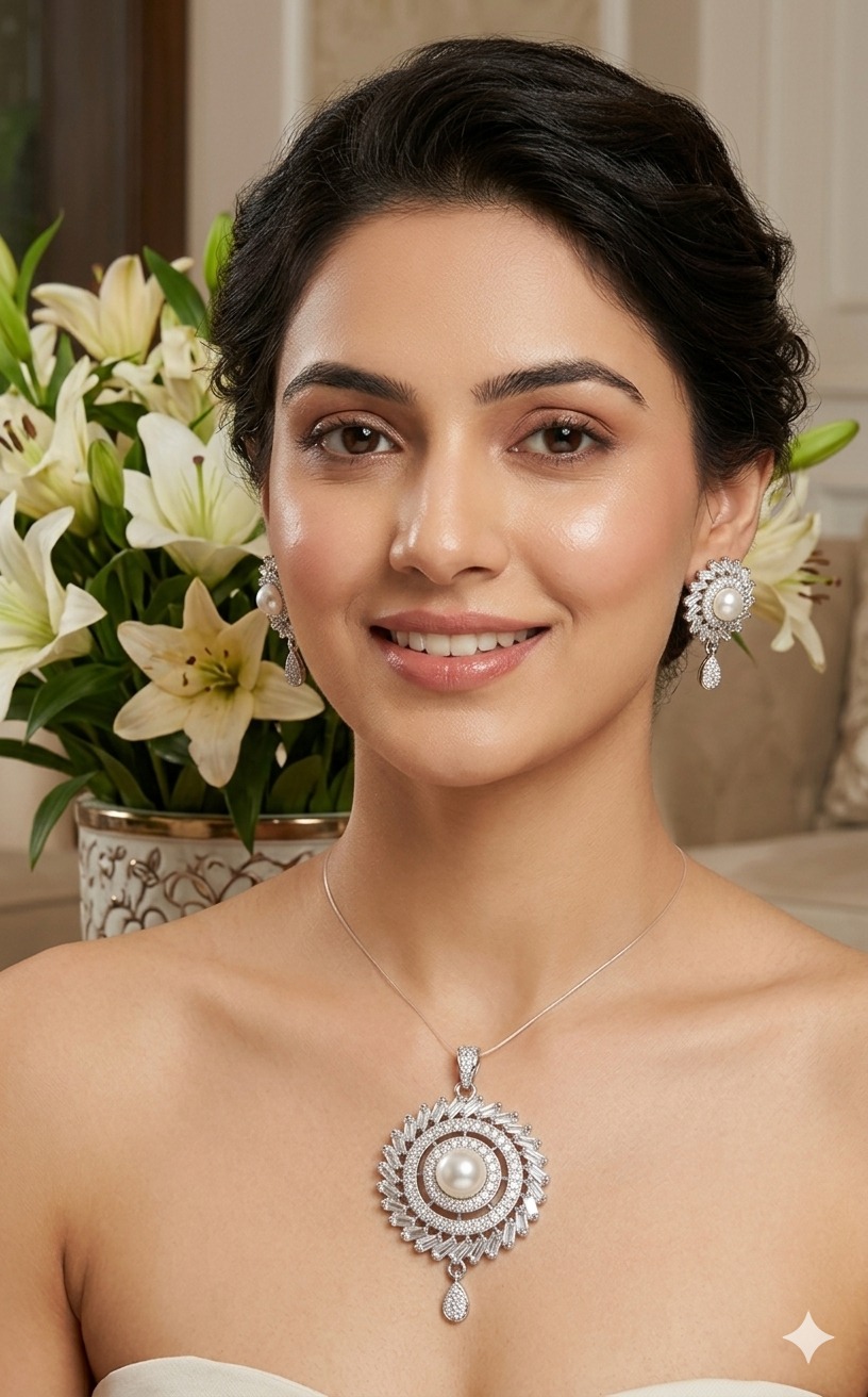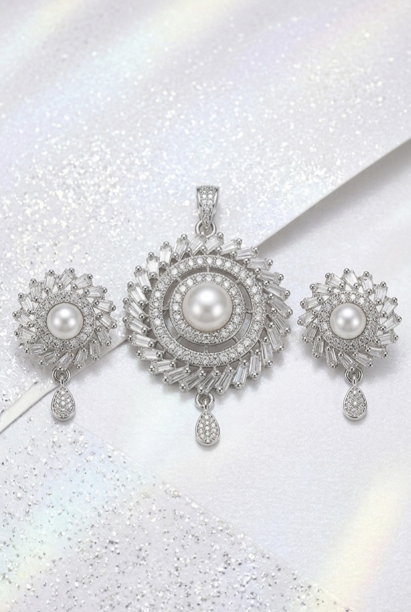 Illuminate your style with the radiant charm of our Pearl Solar Pendant Set, inspired by the brilliance of the sun. This stunning set features a luminous pearl centerpiece, surrounded by a dazzling halo of finely set American diamonds that create a captivating sunburst effect.